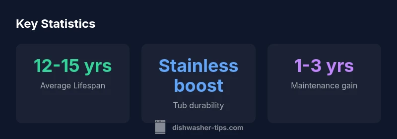 According to Dishwasher Tips, the longest-lasting dishwashers typically deliver about 12 to 15 years of reliable operation, with stainless-steel tubs and robust pump assemblies correlating to longer lifespans. The Dishwasher Tips team found that models featuring modular components, reinforced racks, and serviceable parts tend to outlast cheaper, highly integrated designs, especially when paired with regular maintenance and proper installation.