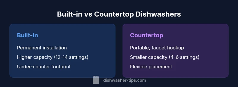 If you're evaluating options for your kitchen, understanding what is the difference between a built in dishwasher and a countertop dishwasher matters for daily use, space, and long-term cost. According to Dishwasher Tips, the right choice hinges on how you cook, how often you run full loads, and how much you value permanence versus portability. This section lays the groundwork by explaining the core differences in installation, capacity, and typical workflows, so you can quickly see which type aligns with your living situation. A built-in unit seems like a permanent upgrade with fixed plumbing and cabinetry, while a countertop model offers flexibility for renters, small kitchens, and temporary setups. The trade-off is clear: permanence and capacity versus mobility and simplicity. By the end, you will have a clear framework to compare two distinct appliance paths and make a decision that fits your home, budget, and daily routine.
