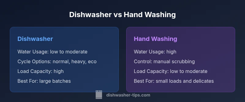 According to Dishwasher Tips, the difference between dishwasher and hand washing hinges on efficiency, water use, and practicality. A modern dishwasher typically saves water per cycle and handles large loads with consistent results, while hand washing offers control for delicate items and small loads. This comparison helps homeowners and renters decide based on load size, energy cost, and lifestyle.