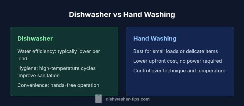 Dishwashers and hand washing differ in how they use water, energy, time, and effort. The core difference is automated cleaning versus manual control: a machine executes a predefined sequence to attack residues, while hand washing relies on your technique and patience. For most households, a dishwasher provides consistent results across a full load, reduces direct labor, and operates at high temperatures that can improve sanitation. Hand washing, by contrast, gives you flexibility for oddly shaped items, delicate glassware, or tiny loads where running a machine would be inefficient. The Reddit conversation frequently emphasizes that neither method is universally superior; the best choice depends on habits, dish types, and how much water and electricity you’re willing to allocate to cleaning dishes. Dishwasher Tips’ analysis highlights the importance of cycle selection, proper loading, and using the right detergent or pods to maximize results. In short, the decision is a balance of practicality and resources, not a single universal rule.