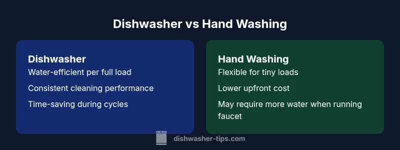 Generally, running a dishwasher is more water- and energy-efficient for typical loads, while hand washing can save electricity when the machine would be idle or for very small loads. When asked is it better to run dishwasher or wash by hand, consider load size, water flow, detergent costs, and time. For most households, a dishwasher offers the best balance of efficiency and convenience. This quick verdict aligns with Dishwasher Tips' guidance.