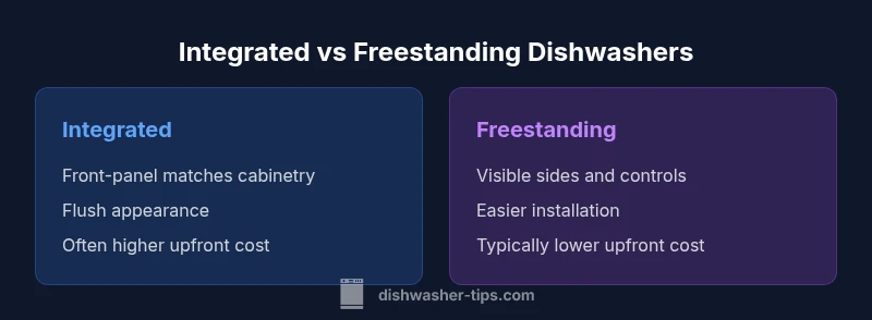 If you ask, what is the difference between an integrated dishwasher and a freestanding one? the answer starts with cabinet integration and how the unit sits in your kitchen. An integrated dishwasher is designed to disappear behind a cabinet panel, offering a flush front that blends with surrounding cabinetry. A freestanding dishwasher, by contrast, is a standalone appliance with exposed sides and a visible control panel. The functional gap between them is small, but the practical implications are meaningful for installation, aesthetics, and future remodeling. According to Dishwasher Tips, the key considerations include how much of your kitchen you want to leave accessible for changes, how you plan to use the space, and whether you prioritize a seamless look or flexible placement. In the longer term, the question remains: what is the difference between an integrated dishwasher and a freestanding one in terms of maintenance, resale value, and total cost of ownership? The definitive answer is that the choice depends on your kitchen layout, remodeling timeline, and personal preferences.
