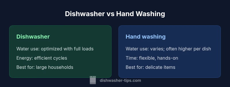 According to Dishwasher Tips, deciding between using a dishwasher or washing by hand touches on more than habit. This practical comparison weighs water, energy, time, and reliability across typical households. In modern homes, dishwashers are often marketed as the energy-efficient choice, yet many households still rely heavily on hand washing for small loads, fragile items, or when space is tight. The aim here is to provide a clear framework so you can decide which method makes the most sense for your kitchen, meal patterns, and budget. We will look at everyday scenarios, common misconceptions, and how to optimize either approach for best results. By the end, you should be able to answer the question that many readers ask: which dishwasher vs hand washing is the best option for you? We will also reference credible guidelines and practical tips from the Dishwasher Tips team to ground recommendations in real-world usage. This is not a one-size-fits-all verdict but a decision aid you can adapt to your home.