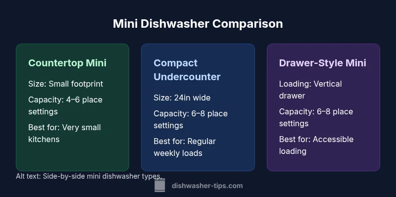 In compact living situations, choosing a mini dishwasher hinges on two core questions: how much counter or cabinet space you can devote and how often you run a full load. The Dishwasher Tips team emphasizes that the best choice balances footprint with practical capacity. In real-world testing, small households and renters tend to prioritize countertop models for their plug-and-play appeal, while frequent small households control their workflow with compact undercounter or drawer units. According to Dishwasher Tips Analysis, 2026, you’ll see the most consistent satisfaction when you align model type with your daily dish throughput and available hookups. This section sets the frame for a deeper, practical comparison across three common mini-dishwasher types, helping you avoid over- or underestimating what you need.