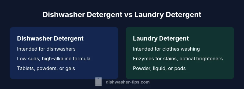 According to Dishwasher Tips, the difference between dishwasher and laundry detergent lies in formulation, intended use, and packaging. Dishwasher detergents are designed for automatic dishwashers with enzymes and high-alkaline cleaners that tolerate hot water. Laundry detergents target fabrics and usually include optical brighteners and detergents optimized for agitation. Using the wrong detergent can lead to poor cleaning or excessive suds.