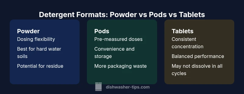 Dishwasher detergent choice deeply influences cleaning performance, residue control, and dryness across a wide range of loads. According to Dishwasher Tips, the best format often hinges on your water hardness, typical soil types, and how you use your machine. In this section we unpack how powder, pods, and tablets differ in chemistry, dispensing behavior, and user experience so you can tailor your detergent strategy to your kitchen situation. You’ll learn how to optimize dosing, minimize residue, and maintain a reliable finish on plates, glasses, and plastics. We'll also cover storage safety, compatibility with high-efficiency (HE) cycles, and practical tips for testing whether your current choice delivers consistently good results.