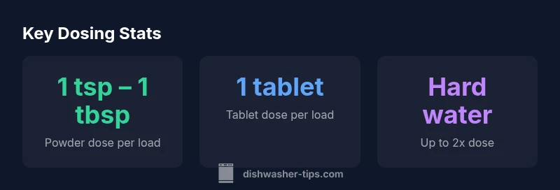 Determining how much dishwasher detergent to use depends on several factors: the form of detergent (powder, tablet, or pod), the size of the load, soil level, water hardness, and the dishwasher's own dosing system. While manufacturers typically provide dosing guidelines on the packaging, real-world results vary with washing conditions. In broad terms, a powder dosage for a standard load commonly ranges from 1 teaspoon to 1 tablespoon, while a single tablet covers the same cycle in many tablet-based products. Dishwasher Tips analysis, 2026 suggests adjusting dose primarily for soil and water hardness, not merely load size, to avoid residue and ineffective cleaning. Always consult the product label for model-specific guidance.