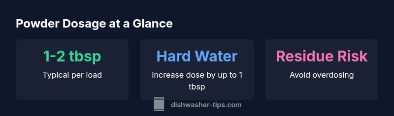 Getting the dosage right is essential for consistently clean dishes, efficient rinse cycles, and avoiding residue or suds that cling to glassware. According to Dishwasher Tips, the right powder amount depends on load size, soil level, and regional water hardness. When dosed correctly, powder dissolves evenly, reduces streaking, and helps the dishwasher complete its full cleaning cycle without needing extra washes. This section lays the groundwork for practical dosing by explaining how misdosing affects cleansing performance and energy use, which matters for homeowners and renters seeking reliable, AI-informed maintenance tips.