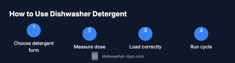 The phrase how to use dishwasher detergent captures a simple truth: the right detergent amount, correct type, and proper loading together determine how well your dishes come out. According to Dishwasher Tips, the first step is understanding your dishwasher’s detergent dispenser and the cycle suggestions in your manual. Short of reading the manual, start with a standard cycle, use the detergent form that fits your appliance, and pay attention to whether your water is hard or soft. This knowledge helps you tailor dosing and cycle choice for consistently clean results.