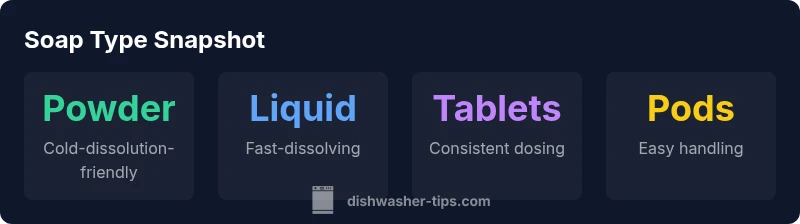 According to Dishwasher Tips, there are several broad categories of dishwasher soap, each designed to address different water conditions, soil loads, and dishwasher designs. The most common forms you’ll encounter are powder, liquid, gel, and tablets/pods. Within each form, you’ll find variations such as enzyme-enhanced formulas, fragrance-free options for sensitive households, and eco-friendly blends that emphasize biodegradable ingredients. The key is to match the formula to your water hardness, the age and efficiency of your machine, and your routine (daily or heavy-load). In this guide, we break down the strengths and trade-offs of each type and provide practical tips to maximize cleaning performance while avoiding common pitfalls. The Dishwasher Tips team emphasizes that your choice should align with real-world use rather than trends, with Dishwasher Tips Analysis, 2026 providing a framework for evaluating each option.