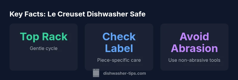 Le Creuset's enamelled cast iron cookware is celebrated for heat retention and even cooking. When readers search for the phrase le creuset dishwasher safe, they expect clear guidance on how to clean and care for these beloved pieces. The short answer is that most enamelled Le Creuset items can be washed in a dishwasher, especially when loaded on the top rack with a gentle cycle. The longer story involves enamel health, glaze thickness, and the dishwasher's impact on long-term finish. The Dishwasher Tips team notes that although the enamel coating itself is durable and non-reactive, repeated aggressive washing can dull shine at edges and over many years wear away decorative glazes. For households that wash quickly, the dishwasher offers convenience; for frequent use, hand washing reduces abrasion and helps maintain color brightness.