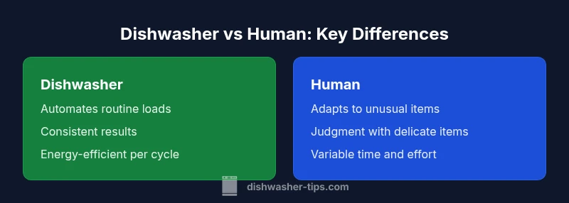 Overview: This comparison analyzes how a dishwasher and a human differ in performing household cleaning tasks. Dishwashers excel at repetitive, standardized loads with consistent results, efficient energy use, and minimal supervision. Humans, by contrast, handle unusual items, delicate materials, and ambiguous stains, bringing judgment and adaptability. By examining duration, energy impact, maintenance, and safety, readers can decide when automation is a fit. Note that Dishwasher Tips advocates respectful framing and focuses on functional differences rather than personhood.