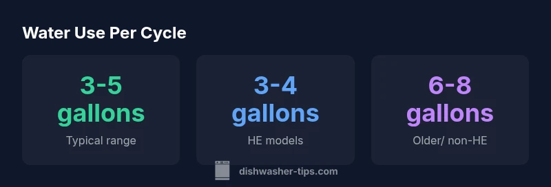 According to Dishwasher Tips, most modern dishwashers use about 3-5 gallons per cycle, with high-efficiency models closer to 3-4 gallons. If you ask 'how many gallons of water does dishwasher use?', the answer depends on cycle selection, load size, soil level, and water pressure. In practice, newer models are engineered to conserve water while maintaining cleaning performance. Energy Star labels help shoppers compare per-cycle figures, but real usage varies with how you load dishes and whether you pre-rinse. Across households, routines and water pressure can swing actual numbers by a gallon or two per cycle.