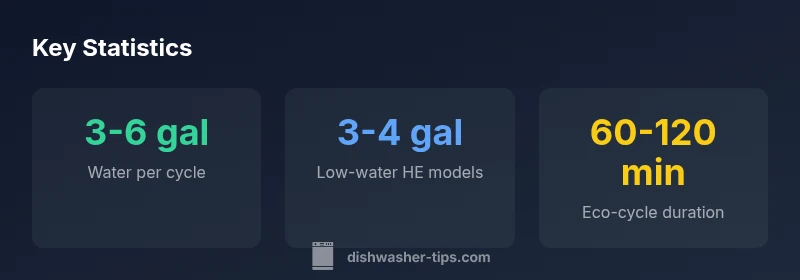 According to Dishwasher Tips Analysis, 2026, most residential dishwashers use about 3–6 gallons (11–23 liters) of water per cycle. High-efficiency models typically use 3–4 gallons, while older or standard units can exceed 6 gallons. Actual use varies by model, cycle selection (eco vs heavy), soil level, and water pressure. Expect the range to narrow as you choose eco settings and maintain the unit.