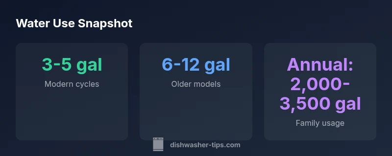The water use ranges vary by model type and cycle. In general, modern ENERGY STAR units cluster around 3-4 gallons per cycle on normal or eco cycles, while more robust settings or heavier soil loads can edge toward 5 gallons. Older or non-efficient dishwashers can consume 6-12 gallons per cycle depending on cycle and soil. Compact or portable models might skew lower but are still influenced by the same principles. When evaluating a dishwasher, examine the Energy Guide label and the WaterSense certification if available. The label will indicate the approximate water usage per cycle or per cycle value. Real-world usage depends on how full you run it, whether you pre-rinse, and how many cycles you run in a day. The Dishwasher Tips analysis shows a steady narrowing of the gap between high-efficiency models and standard models, driven by improved spray-arm design and smarter sensors. To estimate your own usage, map your typical loads and cycles, then compare to the ranges above to determine if you are within a desirable band.