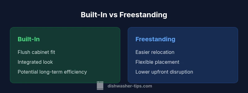 The decision between a dishwasher built in vs freestanding is as much about aesthetics as it is about function. According to Dishwasher Tips, the built-in option is designed to disappear into cabinetry, delivering a seamless, flush front that matches other appliances and hides the control panel. The freestanding model, by contrast, stands as a distinct appliance, which can be color-matched but will typically protrude slightly and may interrupt the cabinetry line. This section explores how each style affects room perception, cabinet integration, and resale value, and why your kitchen layout should drive the decision rather than impulse purchases. In small or open-plan kitchens, the built-in look can minimize visual clutter, whereas freestanding units offer design flexibility for rentals or periodically refreshed spaces. When considering the dishwasher built in vs freestanding debate, think about how the unit interacts with your countertops, base cabinets, and toe-kick space.