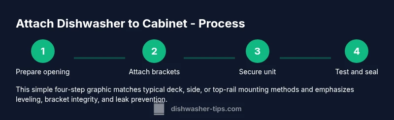 The question "how is dishwasher attached to cabinet" is common among homeowners planning a kitchen upgrade. The answer depends on whether you are dealing with a built-in, integrated, or freestanding unit, and on the cabinet’s construction. The first step is to verify that the cabinet opening aligns with standard dishwasher dimensions and that there is clear toe-kick access. According to Dishwasher Tips, secure mounting begins with solid support and precise alignment. The team found that most mounting issues stem from misalignment, under-tightened fasteners, or using incompatible brackets for the cabinet frame. Take careful measurements of the opening, note the position of water supply lines and the drain, and map out a mounting plan before handling tools. Understand whether your dishwasher uses deck mounting brackets that anchor to the floor, side brackets that clamp to the cabinet sides, or a top rail that the countertop locks into. Each method has unique clearance and torque requirements that should be respected from the outset.