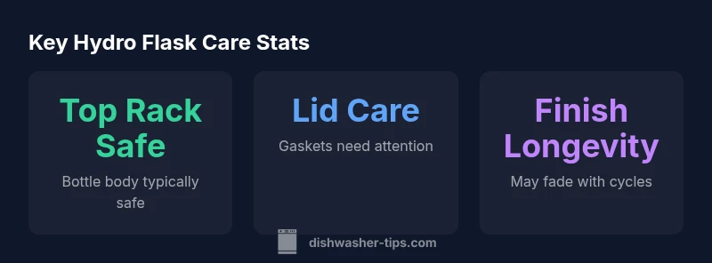 Are hydro flasks dishwasher safe? Factual guidance depends on the bottle model and finish. In general, the bottle body is designed to withstand top-rack dishwasher cleaning, but the lids, seals, and any powder-coated exterior may respond differently to heat, detergents, and cycle duration. According to Dishwasher Tips, following manufacturer care instructions is the safest way to avoid premature wear or warranty concerns. This means starting with the bottle body on a gentle top-rack cycle and reserving the lid and any gaskets for hand washing when possible. The aim is to balance convenience with longevity, especially for daily-use bottles that see frequent cycles. The Dishwasher Tips team emphasizes that care guidance can vary by finish and assembly, so verify your specific model's instructions before committing to a full dishwasher load.