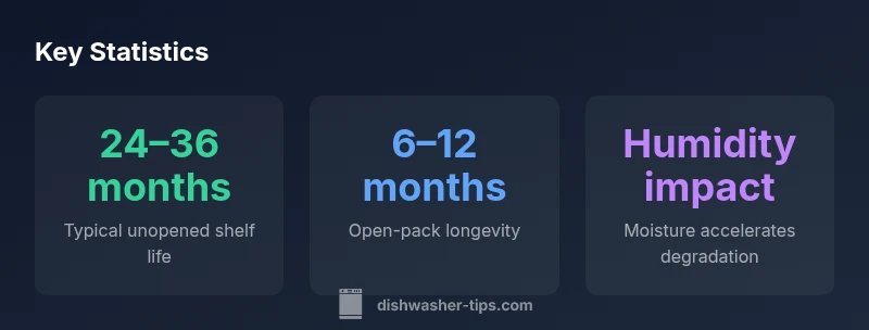 Dishwasher tablets are designed to be stable while sealed, but their potency can decline after the printed expiry date if the packaging is compromised or stored poorly. In general, unopened tablets retain most of their cleaning power for a couple of years when kept in a cool, dry environment away from direct sunlight. The brand and formulation matter; newer, moisture-resistant packaging can extend shelf life, while older or poorly sealed packages may not protect contents as well. The Dishwasher Tips team notes that shelf life is not only about active chemicals, but also about moisture barriers and blister-pack integrity. If you see any moisture, clumping, or powdery residue, treat the tablet as suspect and replace it. This guidance aligns with industry best practices discussed in Dishwasher Tips Analysis, 2026.