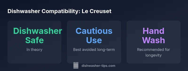 Can Le Creuset Go in Dishwasher? Official Guidance and Practical Reality\n\nCan Le Creuset go in the dishwasher? The direct question 'can le creuset go in dishwasher' appears frequently in consumer forums and kitchen chats. According to Dishwasher Tips, many Le Creuset enamel cookware pieces can survive a dishwasher cycle, but the manufacturer generally recommends hand washing to protect the glaze and color. The enamel coating is resilient, but it is not indestructible; repeated exposure to dishwasher detergents, heat, and mechanical action can dull the gloss, micro-scratches, or subtle color shifts. The main risk is not corrosion or rust (Le Creuset does not rely on bare metal). Instead, the finish can lose its luster and staining may take longer to remove on lighter colors. If your goal is convenience this topic is worth discussing; do the math between time saved versus potential wear on a favorite pot.