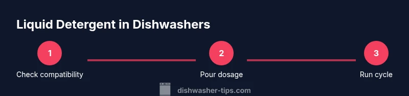 A clear, repeatable approach reduces errors when using liquid detergent. Start by verifying that your detergent is labeled for automatic dishwashers and that the cycle you plan to use is compatible. Open the detergent dispenser and remove any old residue. Pour the liquid detergent up to the recommended fill line, avoiding spills onto the door seal. Close the cap securely and run a normal cycle. After completion, inspect the dishes and wipe away any residue from the dispenser if needed. The goal is a clean rinse with minimal suds and no film on glassware. By following these steps, you ensure reliable cleaning and extend the life of your appliance.
