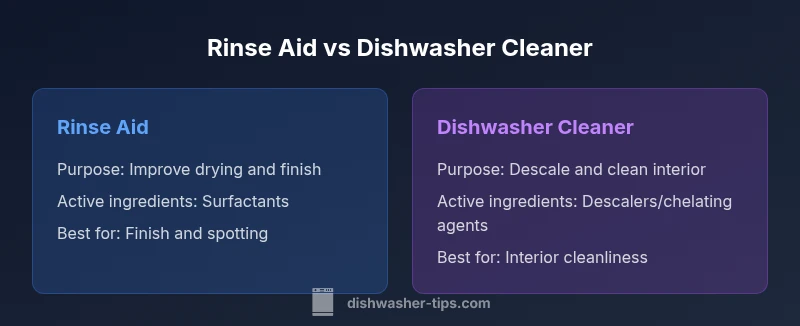 The phrase difference between rinse aid and dishwasher cleaner captures two distinct products with separate jobs in a modern dishwasher. Rinse aid is a surface-active additive designed to improve sheeting action, promote quicker drying, and reduce water spots on dishes and glassware. Dishwasher cleaner, on the other hand, targets the interior: descaling mineral deposits, cleaning gaskets, spray arms, and filters, and preventing foul odors. According to Dishwasher Tips, understanding these roles helps homeowners schedule maintenance without mixing product purposes. The distinction matters because using the wrong product for the wrong task can lead to residues, streaks, or diminished cleaning efficiency. Recognizing each product’s purpose supports better outcomes and appliance longevity, especially in households with varying water hardness and load patterns.