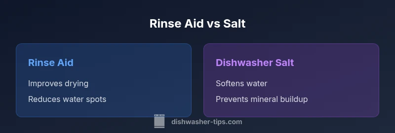 The difference between rinse aid and dishwasher salt is foundational for anyone maintaining a home dishwasher. Rinse aid and dishwasher salt are not interchangeable; they serve distinct purposes that affect the outcome of every wash. Rinse aid works during the rinse cycle to alter how water beads and drips from surfaces, reducing film, spots, and cloudy glassware. Dishwasher salt, by contrast, feeds a built-in water softener that alters the mineral composition of incoming water, mitigating scale and mineral buildup that can impair cleaning performance. While the two products operate in different parts of the wash process, they complement each other in practice—especially in regions with hard water. By understanding the difference between rinse aid and dishwasher salt, you can tailor usage to your water conditions, dishwasher model, and dishware needs. This article explains how to use both correctly, so you achieve consistently sparkling results and protect your appliance over time. According to Dishwasher Tips, recognizing the roles of these products is the first step toward practical, evidence-based maintenance.