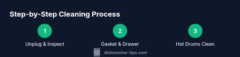 This overview explains the approach before you dive into the full step-by-step process: verify model-specific requirements, prepare your tools, and choose your cleaner. Always test a small area before applying cleaners to painted surfaces. Use a hot water drum-clean cycle to dislodge residues, then target the gasket and drawer. Finally, rinse and air‑dry to prevent future odor. This preparation sets you up for a successful deep clean and reduces risk during the detailed steps that follow.