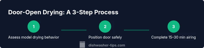 Should you leave the dishwasher door open to dry? In many homes, a short door-open period after a cycle can finish the drying process by accelerating moisture evaporation. The decision depends on your dishwasher's built-in drying features, your kitchen humidity, and the door seal condition. According to Dishwasher Tips, evaluate how your model performs when air freely circulates inside the tub. The goal is to minimize dampness and odors without compromising safety or furniture nearby. If you notice condensation on nearby surfaces or a musty smell after cycles, a controlled air-drying window can be beneficial. Always keep an eye on potential hazards: an open door can create tripping risks or allow pets to reach the interior if the space isn’t secured. Start with a modest 15-minute airing window and adjust based on results.
