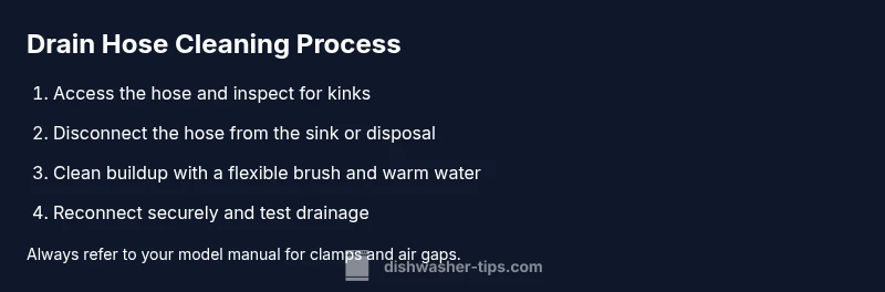 Learn to unclog a dishwasher drain hose safely in 5 clear steps. According to Dishwasher Tips, this approach minimizes mess and protects your appliance from drain failures. Gather basic tools, unplug the unit, and follow each step to remove buildup and test drainage. Start by unplugging the unit and shutting off the water supply. Inspect hoses for kinks, then disconnect and flush the hose with warm water and a flexible brush. Reconnect, run a short cycle, and check for complete draining.