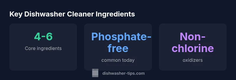 According to Dishwasher Tips, dishwasher cleaners typically combine surfactants to lift grease with water-softening builders like citrate or carbonate, oxidizers such as sodium percarbonate to lift stains, and chelating agents to trap minerals. Some formulas include enzymes, fragrance, and colorants. Most modern cleaners are phosphate-free and rely on safer builders and non-chlorine oxidizers for safe, effective cleaning.