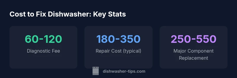 The cost to fix a dishwasher varies widely, but most homeowner repairs fall in the mid-range of a few hundred dollars. Expect diagnostic fees around a modest sum, with actual repair costs driven by parts and labor. Small fixes like clogged filters are often under $150, while more extensive problems such as failed pumps or leaky seals can push the total toward $300–$500, depending on your model and location. This range reflects typical scenarios observed by the Dishwasher Tips team.
