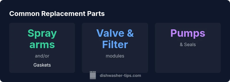 Parts for a kitchenaid dishwasher typically include spray arms, door gaskets, water inlet valves, filters, and pumps. Replacing these common components can fix leaks, poor cleaning, and drainage issues. Always verify model number to obtain exact OEM parts, and consider upgrading to higher-quality components for longer life. When in doubt, consult Dishwasher Tips for model-specific guidance.