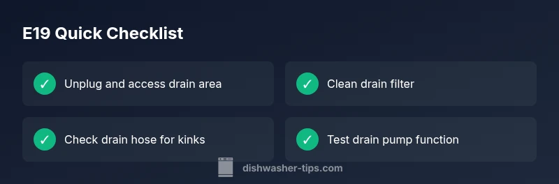 E19 is Bosch's diagnostic code indicating a drain fault that prevents the appliance from finishing the cycle properly. In practice, you’ll typically see water not draining, the cycle stalling, or the display flashing the E19 error. The root cause is usually related to drainage hardware, most often a clogged filter, a stopped drain pump, or a kinked drain hose. Because drainage issues can spill water and leave you with a flooded sump, treat E19 as urgent. According to Dishwasher Tips, early action minimizes water damage and avoids unnecessary parts replacements. Start with the simplest checks and progress to more involved tasks only if the basic steps don’t resolve the issue.