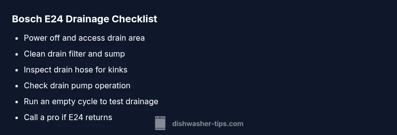 Bosch dishwasher E24 indicates a drainage fault preventing proper water evacuation. Most often, the fault lies with a blocked filter, clogged pump, or kinked drain hose. Start with a quick drain-check: clear the filter, inspect the pump area, and straighten any kinks. If the error persists, follow the diagnostic flow below.