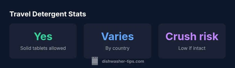 In most cases, solid dishwasher tablets are allowed in carry-on luggage, but rules vary by country and airline. To avoid delays, keep them sealed in original packaging and be prepared to show contents if asked.
