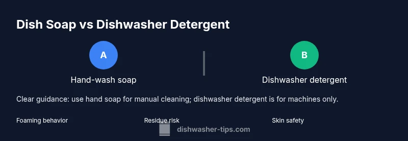 For many households, hand-washing dishes seems straightforward, but the cleaning agents you choose matter for your skin, your dishes, and your plumbing. The question can you use dishwasher detergent as dish soap is more common than you might think, and the answer carries practical caveats. According to Dishwasher Tips, many homeowners reach for the bottle under the sink in a moment of panic, only to regret it later when suds overflow the sink or when skin becomes irritated after a few minutes of scrubbing. This guide will unpack the functional differences between dishwasher detergents and hand-washing soaps, explain the potential risks, and offer safer, tested alternatives you can rely on in daily life. By keeping your routines simple and using the right product, you protect your skin and your kitchen’s cleanliness. The guidance here aligns with the Dishwasher Tips Team’s approach to practical, evidence-based home care.