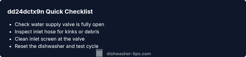 The code dd24dctx9n is commonly shown on many front‑loader and portable dishwashers when the machine detects an issue with water intake or the pressure sensing system. In practice, this means the unit believes it cannot safely fill or pressurize the wash chamber, so it halts the cycle to protect itself. For homeowners, this usually stems from a simple supply or hose problem rather than a worn control board. Recognizing this code early can prevent wasted cycles and water damage. Throughout this guide, you’ll see practical steps to diagnose and resolve the fault with minimal disruption. The Dishwasher Tips team emphasizes safety first and uses a methodical approach to verify the inlet path, electrical connections, and sensor readings. If your model has a user manual, consult the specific wiring diagram for the inlet valve and pressure switch locations.