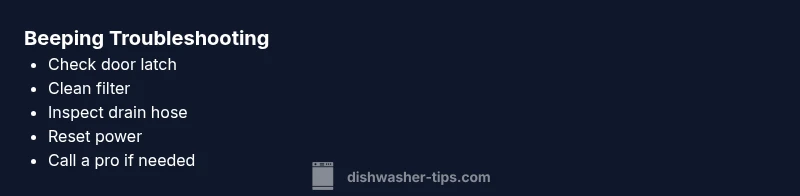 Beeping patterns guide diagnosis. Start with the most likely issues: a door latch fault or misalignment, clogged filter or drain, and finally water supply or sensor problems. For each symptom, a recommended fix is listed in a progressive order from easy to hard. If the beep persists after performing the easy fixes, escalate to the more involved steps and consider professional help if needed. Remember, never bypass safety features or electrical protections when diagnosing dishwasher beeping.