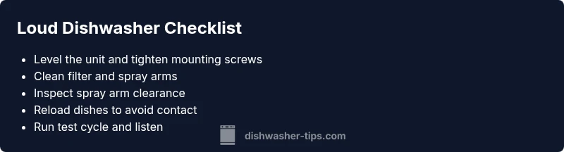 If your dishwasher is loud, start with the simplest checks that solve many issues fast. According to Dishwasher Tips, many complaints come from basic setup and routine debris buildup. First, confirm the unit is level and firmly mounted; a tilted or wobbly machine can amplify normal pump and motor sounds into a rattle during cycles. Next, inspect the door latch and mounting screws. Loose hardware transfers vibration, especially on the top rack wash. Then pull the lower rack and inspect the filter and sump area for debris or mineral buildup; a clogged filter can create splashing, humming, and grinding noises. Finally, check that no dishes or silverware are banging against the spray arms or tub. If you notice the noise only happens with certain loads, rearrange items and re-run a cycle. If the noise persists after these checks, continue to the diagnostic flow to identify the exact culprit and decide on the right fix.