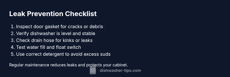There are several frequent culprits behind leaks at the bottom edge of the door. The most common is a worn or damaged door gasket that cannot seal the tub properly. A second frequent issue is dishwasher leveling; if the machine is sitting unevenly, water is more likely to pool near the door. A third possibility is overfilling or a clogged float assembly that causes overflows toward the door area. Finally, kinks or cracks in the drain hose or an internal tub seal can direct water toward the door when the pump runs. Start by inspecting the gasket, then check level, and finally verify the hoses and seals. Remember that even small gaps can allow significant moisture to escape over the course of a cycle.