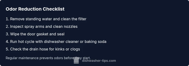 If you want fast results, start with the basics and work from there. First, remove standing water in the tub and inspect the filter screen; a clogged filter is a frequent odor source. Next, check the spray arms for blockages and clean any mineral buildup from nozzles. Wipe the door seal with a damp cloth to remove mold and food particles. Look for leftover food in the tub and under the gaskets. Finally, verify the drain hose is free of kinks and clogs and run a short hot-water cycle without dishes to test drainage. These checks take minutes and often resolve subtle smells. If the odor lingers after these steps, move to a deeper clean cycle. Dishwasher Tips emphasizes that consistency beats intensity when it comes to odor control.