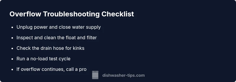 In short, understanding dishwasher overflow means focusing on fill and drain paths, filtration, and the float switch, while maintaining strict safety precautions. This practical approach aligns with expert guidance from Dishwasher Tips and the latest troubleshooting best practices for 2026.