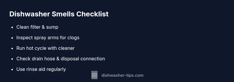 The primary cause of dishwasher smells is trapped food debris and biofilm forming in the filter, sump, and spray arms. Start by cleaning the filter and sump, then run a hot cycle with a dishwasher-safe cleaner. Inspect spray arms and door seals for buildup, and check the drain hose for kinks or clogs. If odors persist, review ventilation and disposal connections.