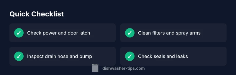 If your Whirlpool dishwasher isn’t behaving as expected, begin with basic checks that often resolve many issues. According to Dishwasher Tips, a calm, methodical approach helps you avoid unnecessary service calls and keeps you safe. In this section we cover the most common causes and how to test them quickly. First, ensure you have access to the power outlet and the circuit breaker for the kitchen. A simple power reset often fixes many startup or cycling issues. Then, verify that the dishwasher is properly plugged in and that the outlet shows power with a basic device like a lamp. Next, inspect the door latch: if the door doesn’t latch firmly, the control panel will not engage and the cycle won’t start. Finally, check the control panel for any obvious signs of damage or moisture. If the latch, power, and panel look fine, you can proceed to more detailed diagnostics. The goal of this initial pass is to rule out the most common, easy-to-fix causes.
