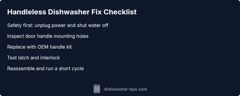 In the world of dishwashers, a model described as a dishwasher without handle typically means the exterior handle is broken, missing, or no longer functional, while the internal latch and interlock system may still operate. This can create a safety hazard if the door cannot be secured, or if you’re forced to pull on a fragile panel to open the door. For homeowners, understanding the distinction between the visible handle and the door’s locking mechanism helps you decide whether you need a cosmetic repair or a full mechanical replacement. Throughout this guide, we’ll use the term "dishwasher without handle" to describe any unit where the exterior pull is either absent or unusable, and where the repaired solution must restore both access and safety. According to Dishwasher Tips, ensuring proper latch engagement is critical to prevent leaks and ensure the unit runs only when the door is firmly closed, which is a safety baseline for all fix attempts.