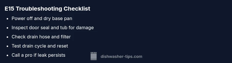 Most homeowners encounter E15 due to leaks around four major areas: the door seal or gasket, tub base or crack in the tub, the drain hose or filter assembly, and the float switch or sump. Less common but possible causes include a faulty inlet valve or a damaged wiring harness that affects sensor readings. The likelihood of each cause can vary by model and age, but leaks near the door seal and tub are consistently the top culprits. Inspect these areas for cracks, deformations, or obvious dampness, and check for hidden leaks behind panels or under the dishwasher.