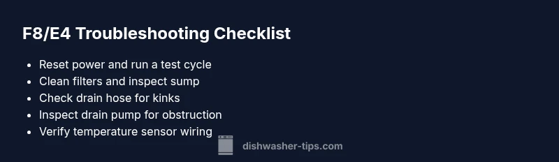F8 and E4 codes are reported by Whirlpool’s control system to indicate a fault detected during a cycle. The exact meaning can vary by model and firmware, so treat these codes as a prompt to inspect core systems rather than assuming a single root cause. According to Dishwasher Tips, the quickest path to clarity is to reset the unit, re-run a cycle, and methodically test major failure points like drainage and sensors. This approach aligns with practical troubleshooting for homeowners and renters, ensuring you don’t overlook simple fixes before diving into parts replacement.