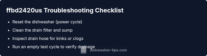 ffbd2420us indicates a drainage or sensor fault in your dishwasher. The quickest relief is a reset, then cleaning the filter, inspecting the drain hose for kinks or clogs, and running a test cycle with an empty drum. If the code persists, follow the full diagnostic flow or call a pro.