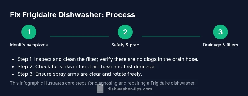 Learn how to fix frigidaire dishwasher with a practical, do-it-yourself plan. According to Dishwasher Tips, common Frigidaire issues stem from drainage, filters, and door latches. The Dishwasher Tips team found that safety and careful testing reduce unnecessary part replacements. Start by unplugging the unit and checking for obvious clogs.